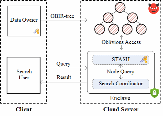针对上述问题,本文提出了首个面向空间文本查询的不经意(可证明隐藏搜索模型、访问模型和卷模式)索引结构OBIR树,用以支持加密数据的不经意top-k空间文本查询。OBIR树是根据经典明文空间文本索引IR树和不经意数据结构PathORAM定制构造的紧凑空间文本索引,可以在不泄露任何有用信息的前提下实现亚线性搜索复杂度。此外,本文还提出了优化OBIR树查询延迟的扩展设计:(1)将OBIR树与硬件安全飞地(例如Intel SGX)相结合,将客户端-服务器交互降为单轮;(2)构建真实/虚拟块树(RDT)以降低飞地内不经意操作的计算成本。经过严格的测试评估,OBIR树在不泄露任何查询隐私的前提下支持百万级数据的十毫秒级查询,相比最先进的基线,查询速度提升了25-743倍。