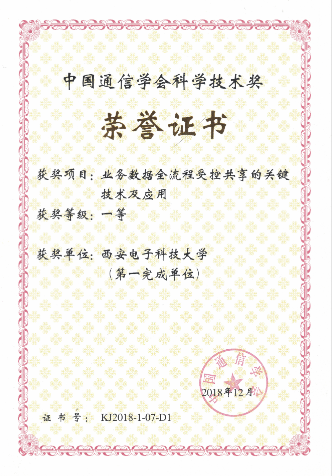 2018年度中国通信学会科学技术奖励评选中,由西安电子科技大学、中国科学院信息工程研究所、北京电子科技学院、武汉达梦数据库有限公司联合完成的成果《业务数据全流程受控共享的关键技术及应用》荣获2018年度中国通信学会科学技术奖(技术发明类)一等奖,我校兼职教授、中科院信工所李凤华研究员和我校银河6163官方网站李晖教授分别为第一和第二完成人。