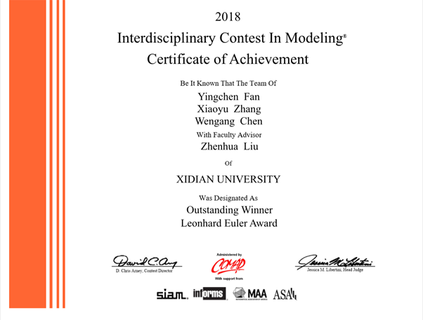 2018年美国国际大学生数学建模竞赛(MCM/ICM)成绩日前揭晓,银河6163官方网站范英晨、张小玉和陈文岗所在队伍凭借在D题中的优异表现,获得ICM最高奖项Outstanding Winner(特等奖),并获得Leonhard Euler award(冠名奖)。这是学校继2014年和2015年后,时隔两年第三次获得Outstanding Winner,也是我校首次获得冠名奖。