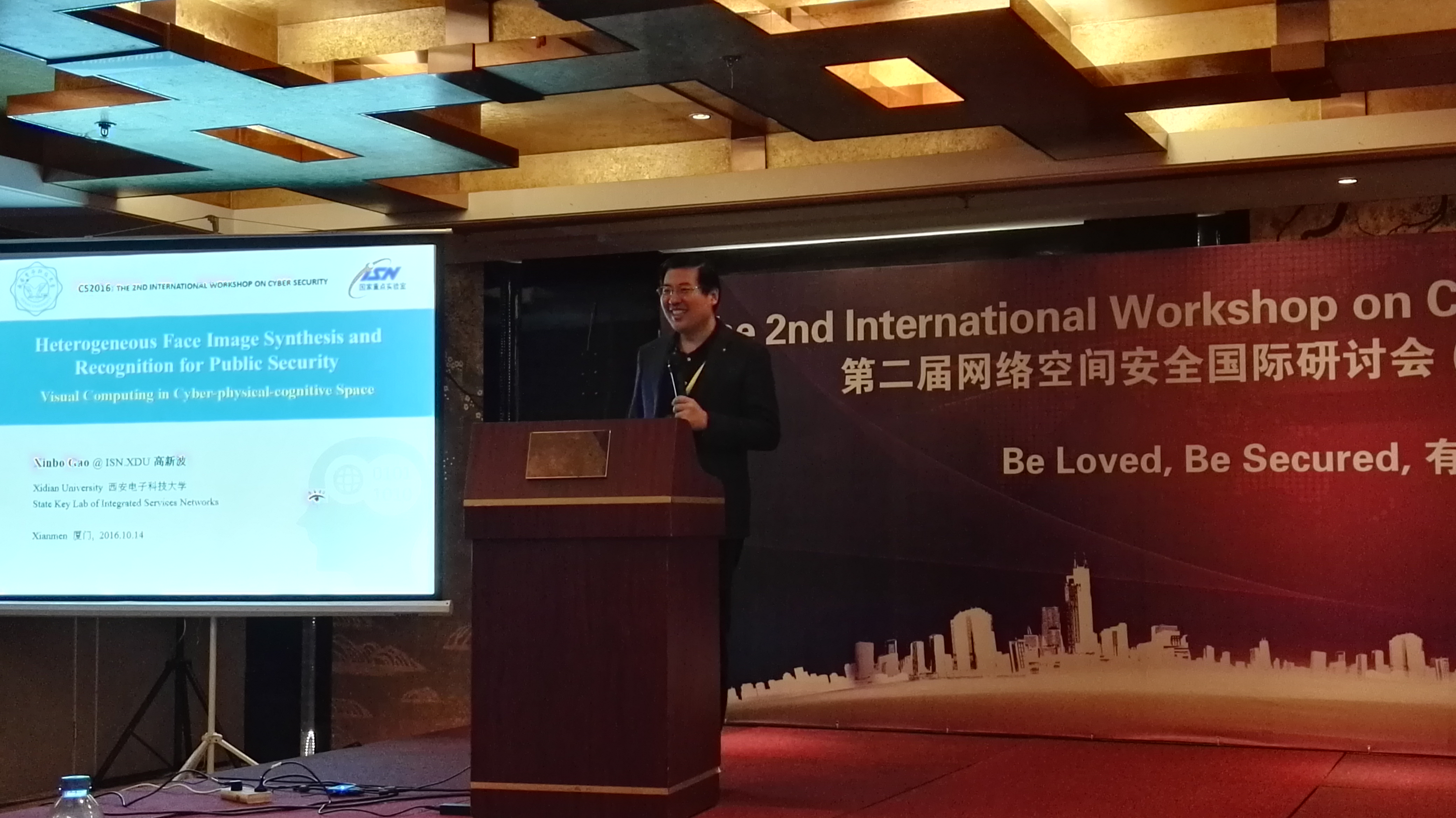 CS 2016会议邀请国内外十名著名学者做大会特邀报告,包括北京邮电大学杨义先教授,西安电子科技大学高新波教授,中科院信工所邓燚教授、路献辉教授、林璟锵教授,华东师范大学何道敬教授,厦门大学纪荣嵘教授,澳洲Monash大学Joseph Liu教授,武汉大学王骞教授,中科院软件所张振峰教授等。其中,西安电子科技大学ISN国家重点实验室主任高新波教授作了题为“Heterogeneous Face Image Synthesis and Recognition for Public Security”的大会特邀报告。我校银河6163官方网站相关师生参加了本次会议,并与在场的专家学者进行了深入探讨和交流。