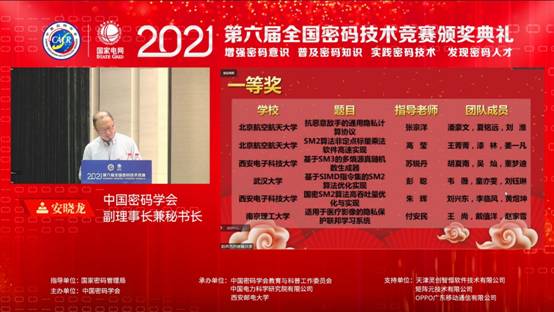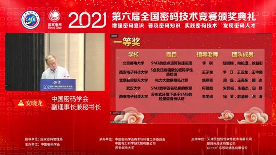 全国密码技术竞赛旨在“提高密码意识、普及密码知识、实践密码技术、发现密码人才”,主要面向全国高等院校学生,是国内级别最高、影响力最大的密码技术大赛。第六届全国密码技术竞赛由国家密码管理局指导,中国密码学会主办,中国密码学会教育与科普工作委员会,中国电力科学研究院有限公司,西安邮电大学承办。