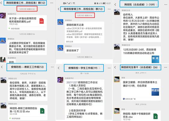 凝聚学院力量,发起成立网信院教师疫情防控志愿服务队的倡议。党旗所指,行动所向,学院积极响应上级部门和学校疫情防控工作部署,由学院党委牵头,面向全院发起成立网信院教师疫情防控志愿服务队的倡议,倡议书发布后,学院领导班子、两位委员、党员和年轻同志带头报名,迅速组建了志愿服务队伍,随时应对南北校区各类情况。志愿服务队人员随时处于待命状态,随时响应西安市、学校、学院的疫情防控相关任务,确保遇到工作任务时,能顶得上、守得住、干得好。截至目前,志愿者服务队已集结43人。按照学院统一部署开展相关工作。