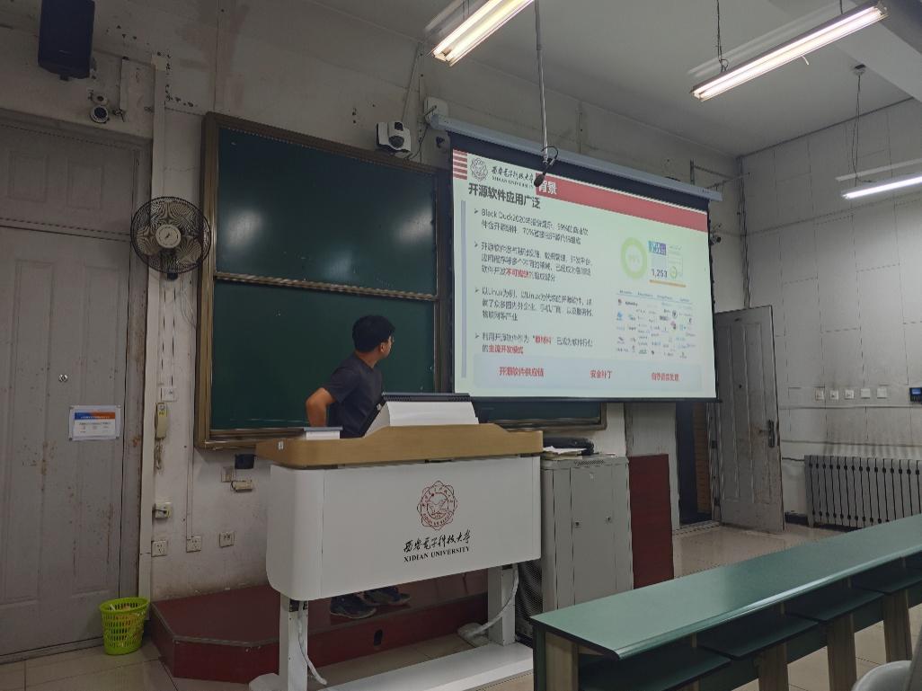 开源社区建设是网络安全领域未来重要的发展方向。学院专门成立了开源软件安全俱乐部,布局谋划开源社区建设。开源社区负责人杨金城博士为同学们介绍了开源俱乐部的相关信息,从开源软件的发展历程讲起,详细阐述了开源生态系统中的安全漏洞、常见攻击手段以及防御策略。此外,杨同学还介绍了俱乐部未来的研究方向,鼓励学生积极参与到这些前沿项目中来。