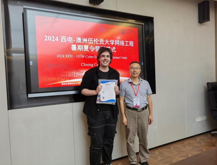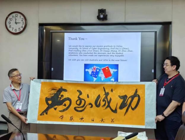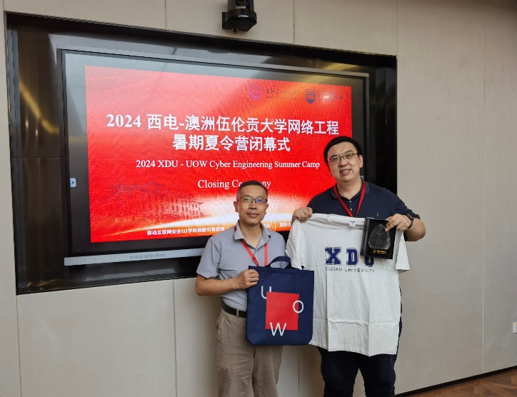 7月12日,夏令营正式闭营。银河6163官方网站院长李晖发表总结讲话。李院长指出,此次夏令营增进了彼此之间的了解和友谊,我们将始终欢迎来自世界各地的学子前来交流学习,共同推进学术进步和文化融合。伍伦贡大学的黄泰然老师回顾了夏令营期间的精彩瞬间,对营员们在短时间内取得的显著进步表示赞赏,特别感谢西安电子科技大学为此次夏令营提供的优质资源和良好平台,感谢所有老师和志愿者的辛勤付出。最后,网信院院长李晖、国际处胡晓夏老师和伍伦贡大学的黄泰然老师共同为表现优异的学生颁发荣誉证书和纪念品。李院长和黄泰然老师代表两方院校互赠礼物,以表达对彼此的深厚敬意和美好祝福。