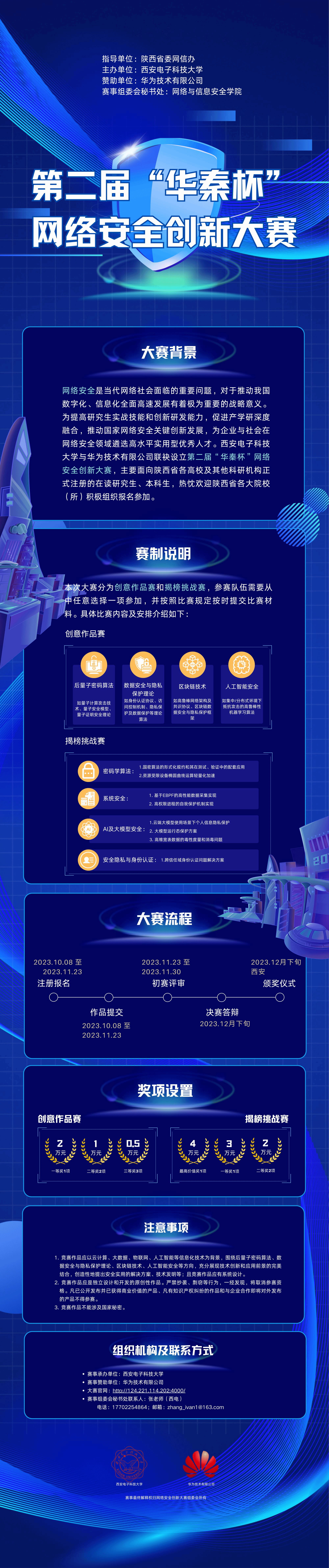 为提高提高研究生实战技能和创新研发能力,促进产学研深度融合,推动国家网络空间安全关键技术创新发展,为企业与社会在网络空间安全技术领域遴选高水平实用型优秀人才,西安电子科技大学与华为公司联袂设立本次“网络空间安全技术”大赛,诚邀各路学子加入探索数字化技术和网络信息安全技术的融合创新。现将第二届“华秦杯”网络安全创新大赛有关项通知如下: