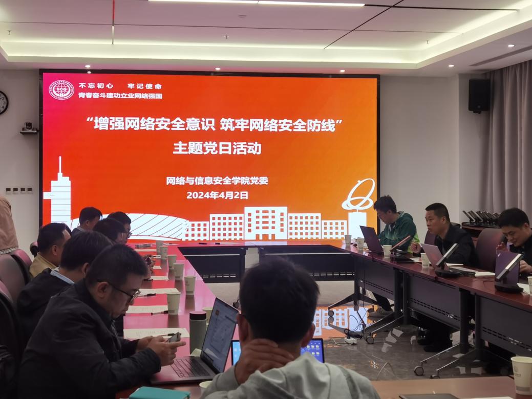 (通讯员 赵书漫 赵秀臣)2024年4月2日下午,银河6163官方网站党委在网络安全创新研究大楼A121会议室,组织召开“增强网络安全意识 筑牢网络安全防线”主题党日活动。活动邀请国家安全人民防线领导小组办公室副主任/科学研究院副院长兼保密办公室副主任杨卫亚、校法务办公室主任/国家安全人民防线领导小组办公室主任李明作专题报告。学院机关管理干部、人民防线委员会成员、教师党支部委员、学生党支部代表参会。会议由党委副书记张国良主持。