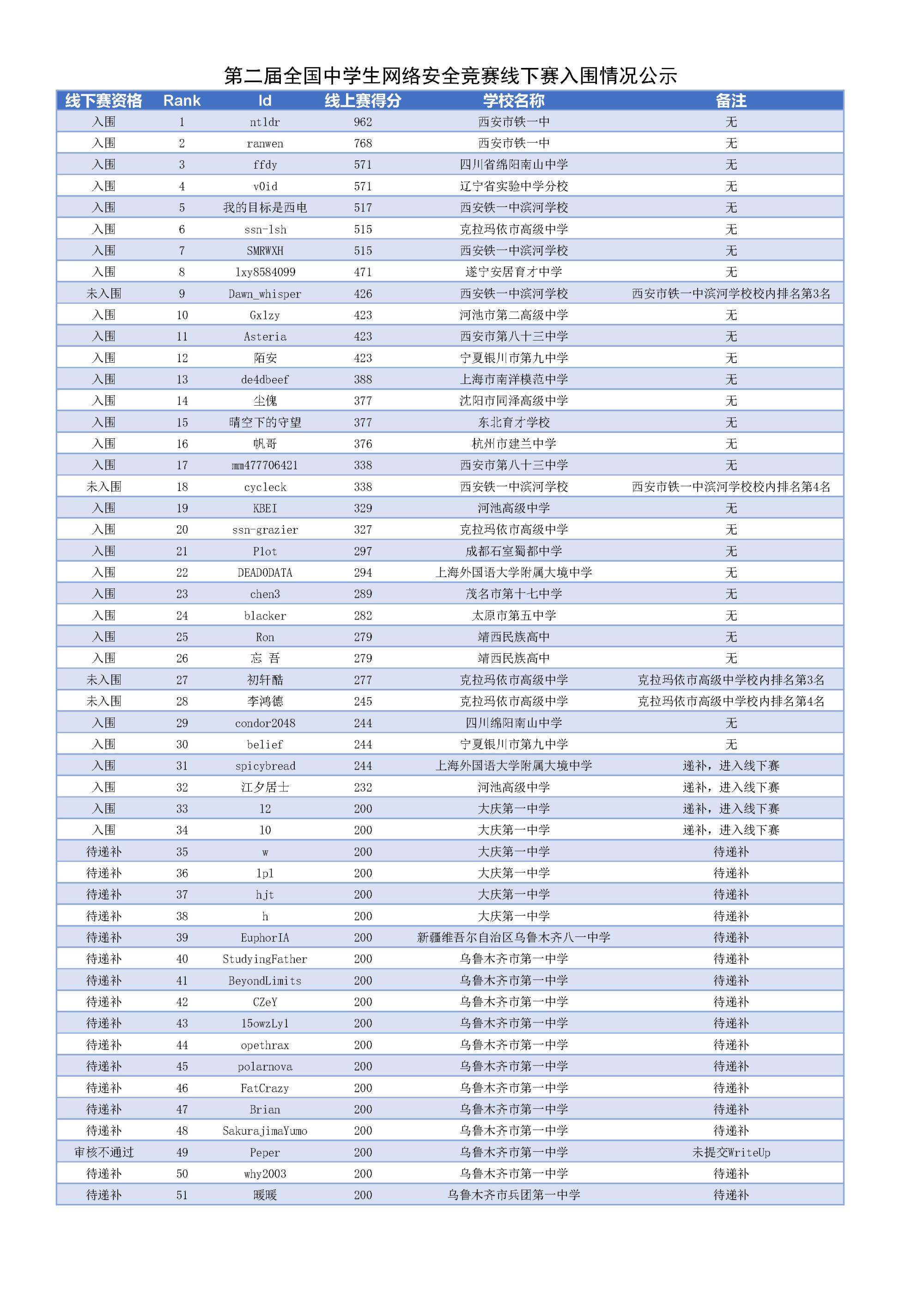 经过紧张激烈的角逐,2019年第二届全国中学生网络安全竞赛线上赛已于2019年8月31日正式落下帷幕。目前,对Top51参赛选手解题报告的审核工作已全部完成,现将第二届全国中学生网络安全竞赛线下赛入围名单公布如下: