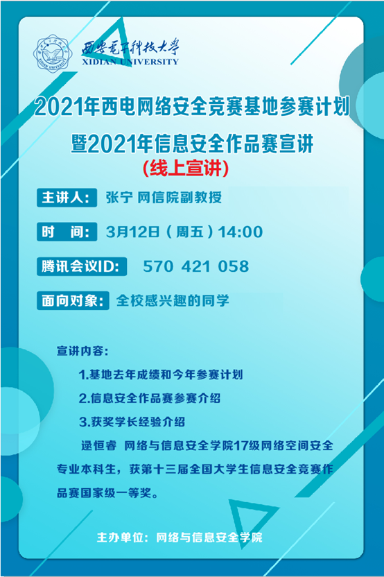 定于3月12日(周五)下午14:00,面向全校学生组织2021年西电网络安全竞赛基地参赛计划暨2021年信息安全作品赛宣讲会,请各位同学积极参加哦!!!