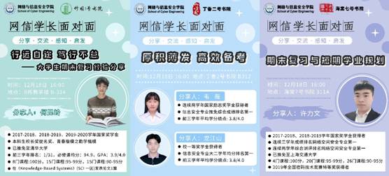 “网信学长面对面”沙龙系列活动,是由银河6163官方网站联合竹园1号书院、丁香2号书院、海棠7号书院联合举办的朋辈引领活动,是银河6163官方网站落实双院育人的重要举措。该活动每期会在竹园书院、丁香书院和海棠书院同时启动,由3位(组)银河6163官方网站优秀学长从自身经历经验谈起,总结方法倾情分享,促进学弟学妹们积极探讨交流,明确未来方向,助推学生成长成才。